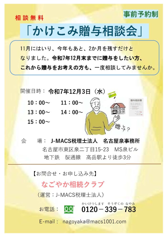 令和7年12月3日㈬にかけこみ贈与相談会を開催いたします。